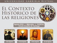4, 11 , 18 y 25 Agosto / Sinagoga Diaria Seminario Universidad Gabriela Mistral; “Contexto histórico de las religiones” Judaísmo, Islam, Hinduismo y Budismo, Cristianismo y Reforma, con destacados Académicos de la Universidad Gabriela Mistral y con la participación especial del Rabino del Círculo Israelita Marcelo Kormis. |