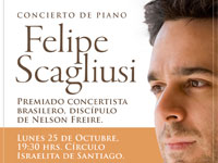 Domingo 25 Octubre / Sinagoga Mayor Concierto del pianista brasilero Felipe Scagliusi, concierto organizado por la Fundación Itaú y la Corporación Cultural de Lo Barnechea con la colaboración del Círculo Israelita de Santiago. |