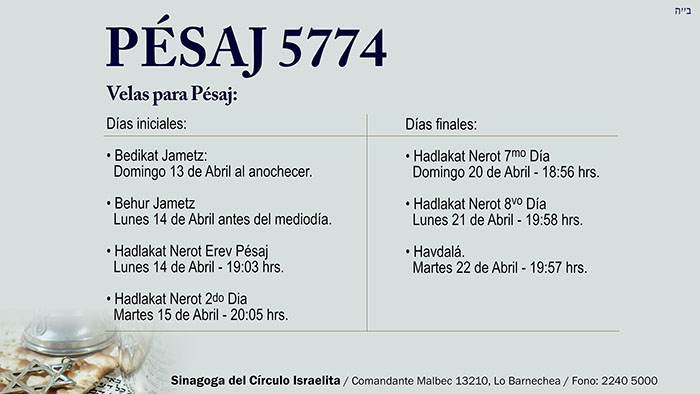 Los cementerios permanecerán cerrados los días: 1 al 13 de abril, Rosh Jodesh Nisan 14 al 22 de abril, Víspera y Pésaj 23 al 29 de marzo, Jodesh Nisan