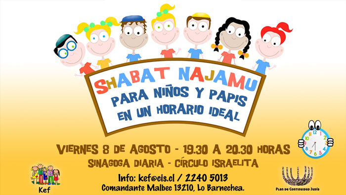 Kabalat Shabat: Viernes 8 de Agosto: 19.30 horas. Shabat Najamu: Viernes 8 de Agosto: 19.30 horas. Shajarit: Sábado 9 de Agosto: 10.00 horas. (en punto) Parashá: Vaetjanan