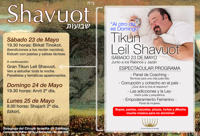 Kabalat Shabat: Viernes 15 de Mayo: 19.30 horas. Shabat Kef: Viernes 15 de Mayo: 19.30 horas. Shajarit: Sábado 16 de Mayo: 10.00 horas. (en punto) Parashá: Behar - Bejukotai