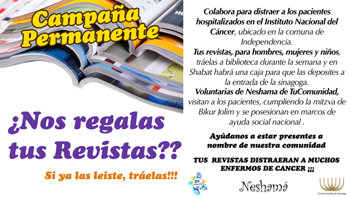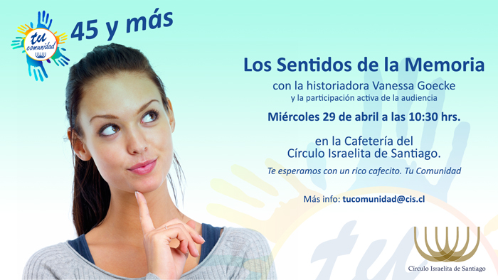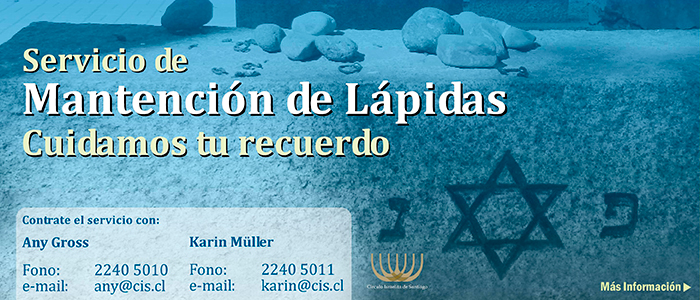 El Domingo 26 de Abril se llevará a cabo la inauguración de las siguientes lápidas: Cementerio Conchalí 10.30 horas. Hannelore Munter (Z.L.) 11.00 horas. Juana Rapaport Fridman (Z.L.) 11.30 horas. Jacqueline Testa Kirshbom (Z.L.) 12.00 horas. Frida Gaysinsky Chechelnitzky (Z.L.) 12.30 horas. Emilia Guendelman Parnes (Z.L.)